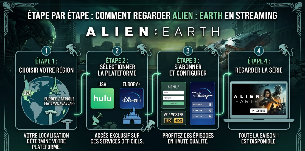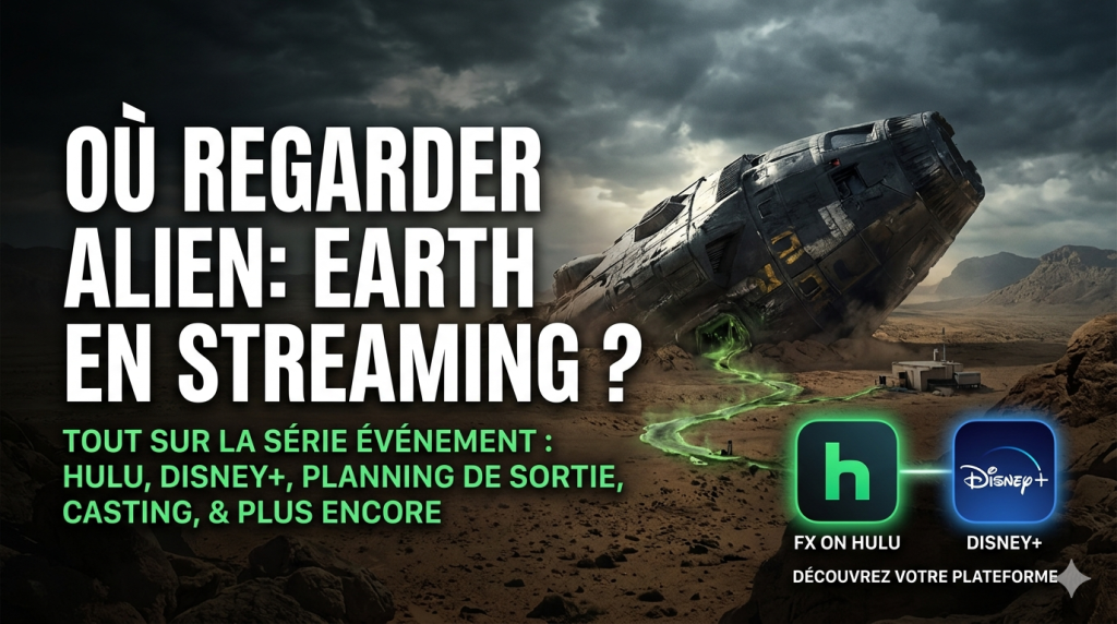 Aliens Earth (Alien: Earth) est disponible en streaming depuis le 12 août 2025. La saison 1 complète avec 8 épisodes est accessible sur Disney+. Aux États-Unis, la série est exclusive sur Hulu via FX. L’histoire se déroule sur Terre avec une atmosphère horrifique fidèle à l’univers Alien tout en apportant des créatures et designs inédits. Le casting met en avant Sydney Chandler (Wendy), Timothy Olyphant et Alex Lawther. La série obtient 94 % sur Rotten Tomatoes et a déjà été renouvelée pour une saison 2.